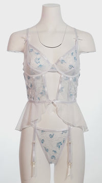 Unlined underwire embroidered merrywidow with ruffles and matching panty.