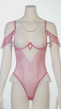 Unlined underwire lace and mesh teddy with ruffle detail.