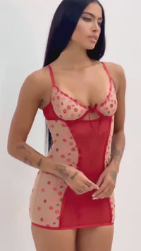 This romantic chemise slip combines sheer mesh with delicate kiss embroidery appliqués to create a flirtatious and unforgettable look. The elegant, flowing silhouette flatters your figure while the playful kiss motifs add a touch of romance and seduction. This piece is perfect for modern romantics seeking an extraordinary intimate experience.