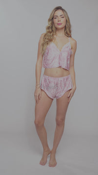 A delicate floral print in colors that evoke rest and relaxation. Two piece set with lace trims, adjustable straps and a loose silhouette.